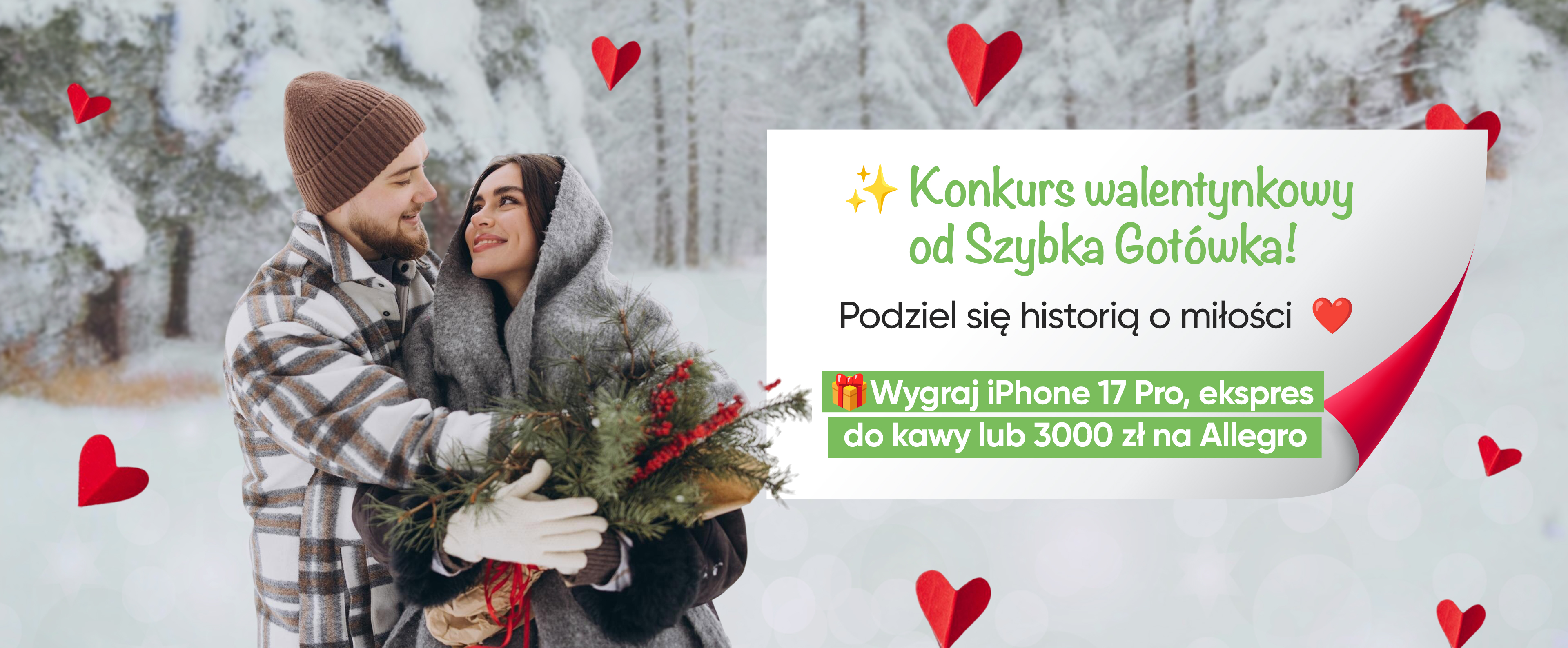 Weź udział w walentynkowym konkursie Szybka Gotówka 2026! Podziel się swoją historią miłosną, złóż wniosek w aplikacji i wygraj iPhone 17 Pro, ekspres do kawy De’Longhi lub bon Allegro 3000 zł. Sprawdź zasady i terminy.09.02.2026
