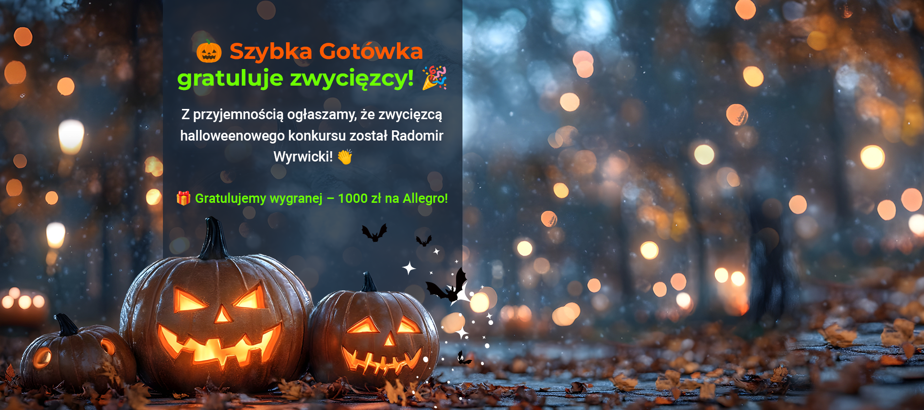 Wyniki konkursu „Halloweenowe plany z Szybka Gotówka” już są! Gratulujemy Radomirowi Wyrwickiemu, który zdobył bon o wartości 1000 zł na zakupy w Allegro. Sprawdź, jak wyglądała nasza halloweenowa zabawa!03.11.2025